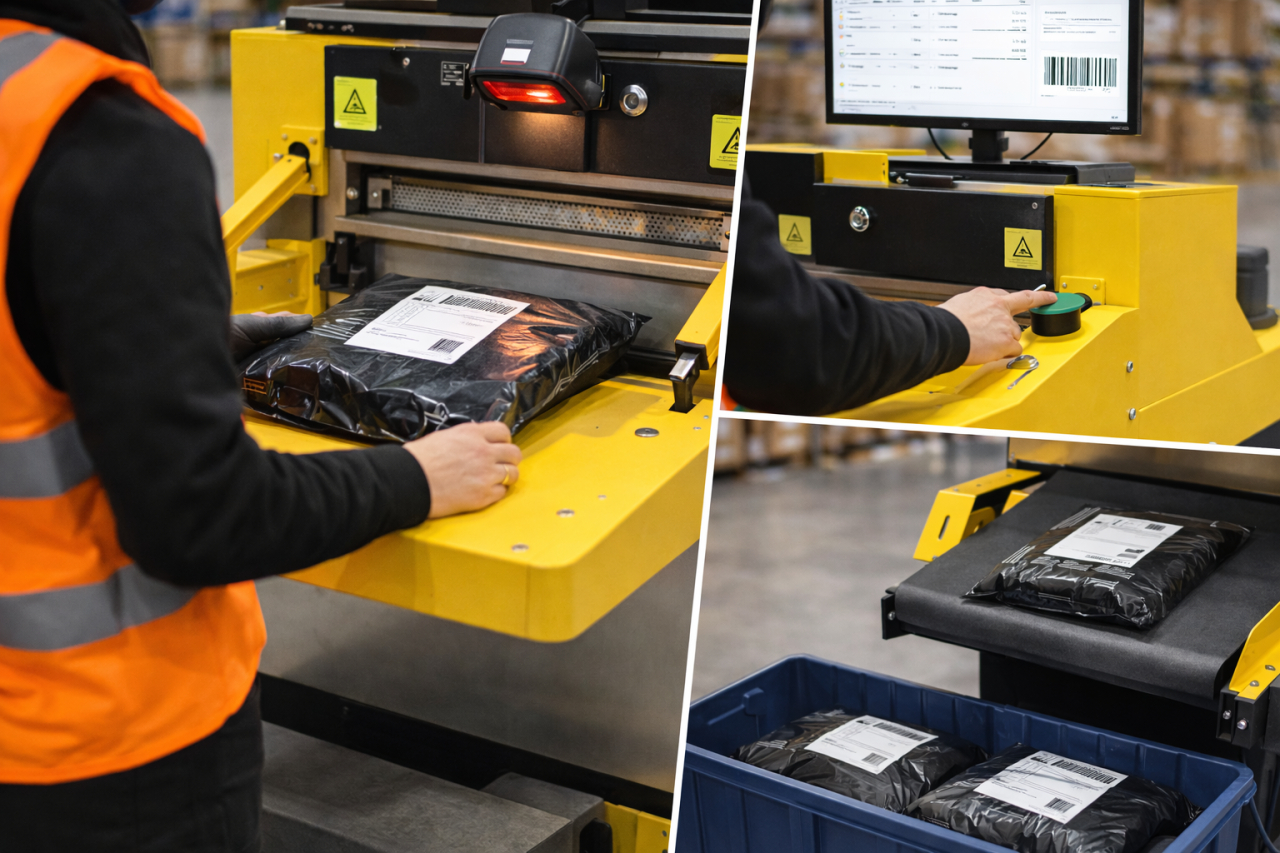 Gdy inteligentne kurtyny optyczne wykryją, że dłonie operatora opuściły strefę bezpieczeństwa, maszyna samoczynnie inicjuje proces hermetycznego zgrzewania. Odporna na warunki atmosferyczne paczka jest natychmiast zrzucana na zintegrowany przenośnik taśmowy (conveyor), skąd trafia bezpośrednio do kosza kurierskiego.